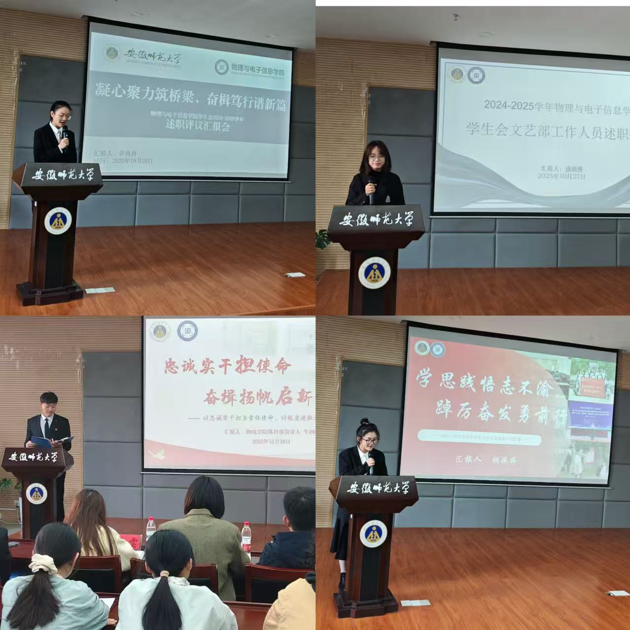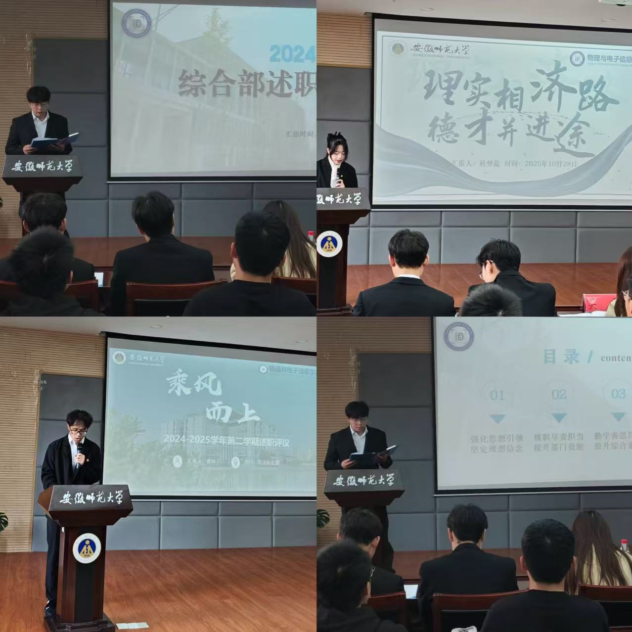 为进一步提高学生会的工作效能和服务意识,10月28日,物电学院在物理楼304会议室召开2024-2025学年学生会述职评议大会。学院团委副书记、学生会指导教师邹孝龙,电子爱好者协会指导教师张月停,校学生会代表苏晨旭,学院学生团委副书记吴雲出席会议。院学生会全体成员和各班级学生代表参加会议。