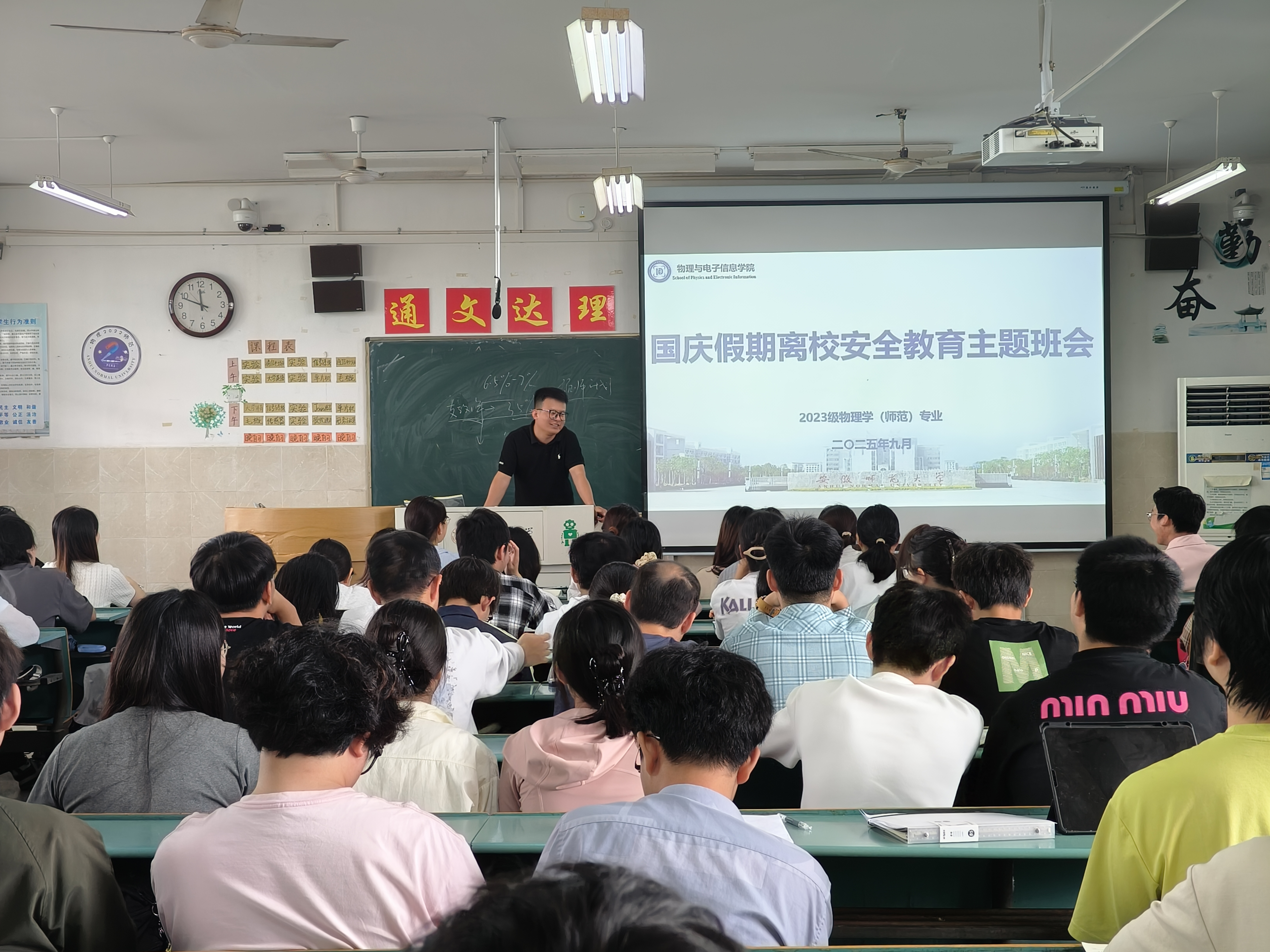 9月28日,2023级物理学(师范)专业召开国庆假期离校安全教育主题班会,班级全体学生参会,辅导员邹孝龙主持会议。