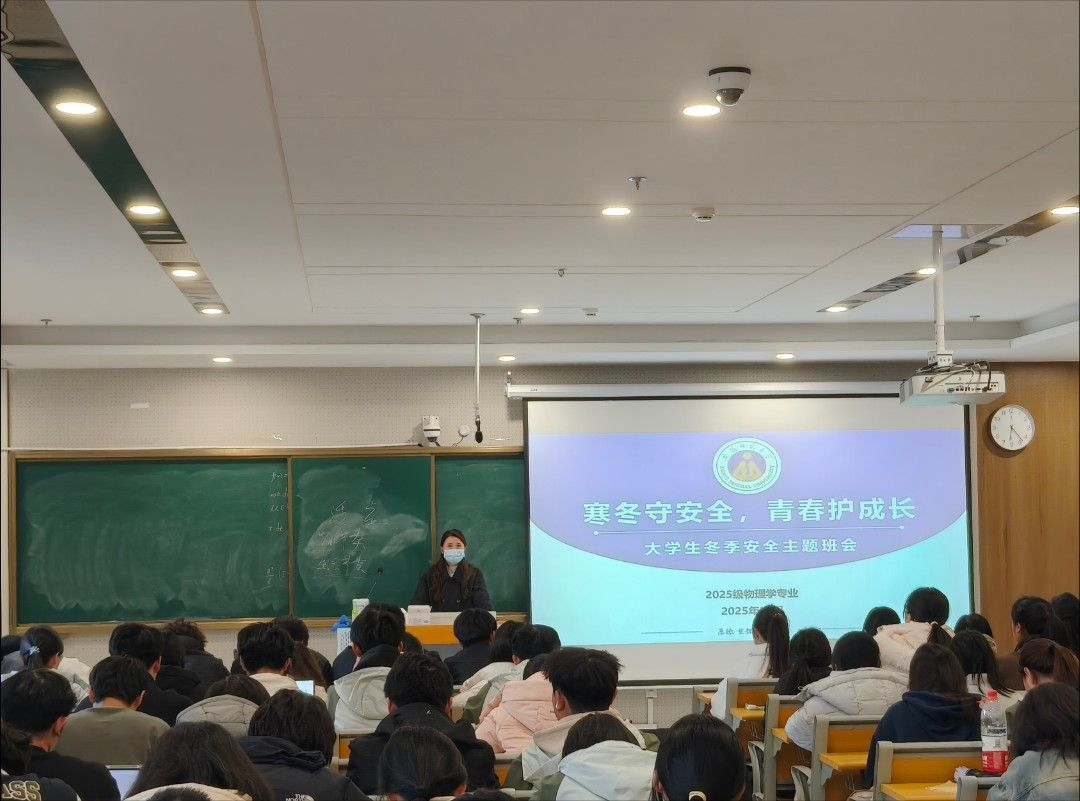 为筑牢冬季校园安全防线,12月3日2025级物理学(师范)专业“寒冬守安全,青春护成长”主题班会于清源楼C407成功举办,会上全体同学认真听讲,积极参与互动与案例讨论。班会让“安全第一,预防为主”的理念深入人心,有效提升了同学们应对冬季各类风险的意识和能力。
