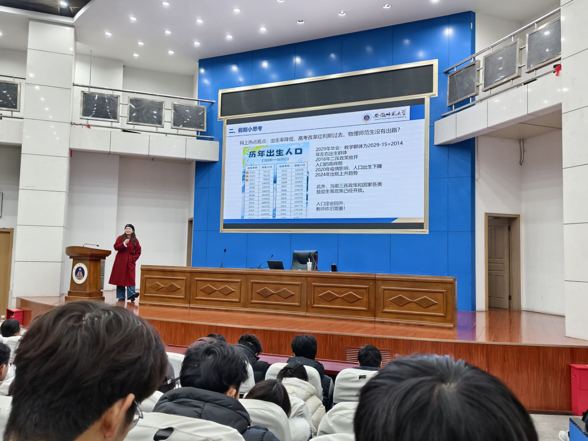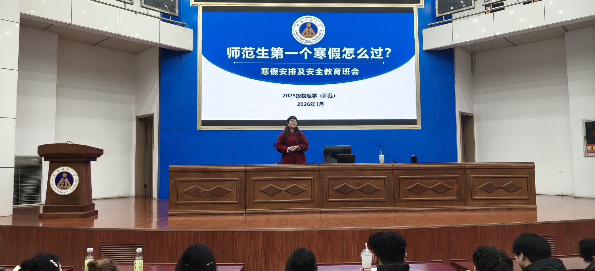 1月2日,2025级物理学(师范)专业学生在敬文报告厅举办了一场以“师范生第一个寒假怎么过?”为主题的寒假安排及安全教育班会。本次班会由辅导员李慧芳老师主讲,各位班主任以及全体同学参与聆听,旨在帮助大一新生合理规划假期生活,明确师范生角色定位,同时加强安全意识教育,以充实、有序的姿态迎接大学首个寒假。